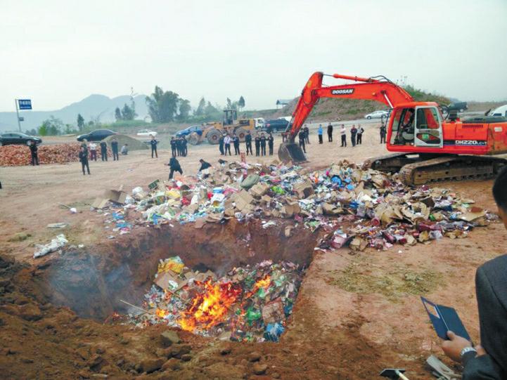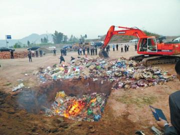 华西城市读本讯(记者 白川东)“挖机碾压,汽油燃烧,挖坑填埋。”昨日上午,巴中城郊的一块空地上,5车货物被公开销毁填埋,引起周围群众阵阵喝彩。