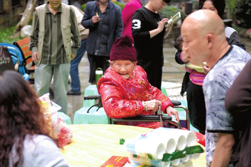 这场寿宴的主角是100岁的喻明兰婆婆,她穿着喜庆的大红袍坐在院子里看着人来人往,眼睛笑弯成了两道月牙儿。“高兴!高兴!”虽然大摆筵席让一生节俭的喻婆婆有些替儿孙心疼钱,但想着这一天终于能拍张全家福,她总算放宽了心。