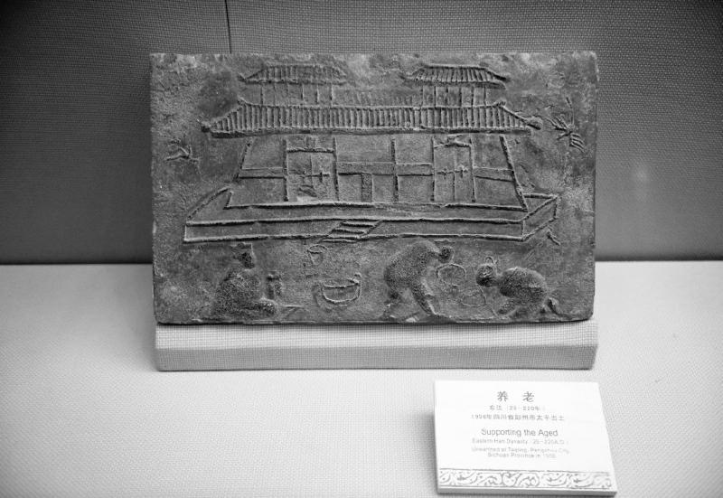 1956年出土于四川彭州太平乡的东汉养老画像砖,是汉代养老风俗的写照,证实了史书上记载的两汉养老尊老之风。这方画像砖正面勾画了一座建于台基之上的仓房,前方正中有踏道利于上下。房前左方,一人穿长服席地而坐,似为管理仓房的小吏,前面放置着量器。右下角有一个执鸠杖的老人,躬身坐于地面,手扶粮袋,注视着仆役用量器分发粮食。