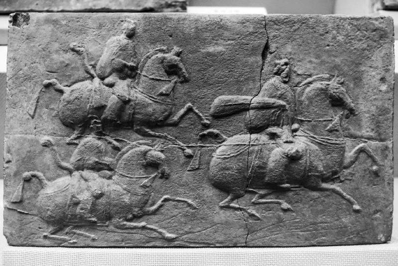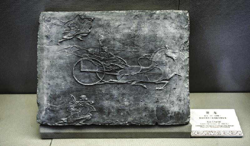 民国时期在四川成都市郊出土的一件斧车画像砖,画面上一马驾无盖轺车疾驰,车上树一斧,斧柄有彩绘,车箱两侧斜插带彩饰的长矛。车上乘坐二人,右为御者,右手执辔头,左手扬鞭。车后两侧有步卒二人负旗徒步以趋。此车为县令以上官吏的导车,走在最前端开道。《后汉书·舆服志》:“县令以上,加导斧车。”画面上刻画汉代马车的驾驭方法比较真切,马匹矫健,四蹄腾空,整个画面极具动感。