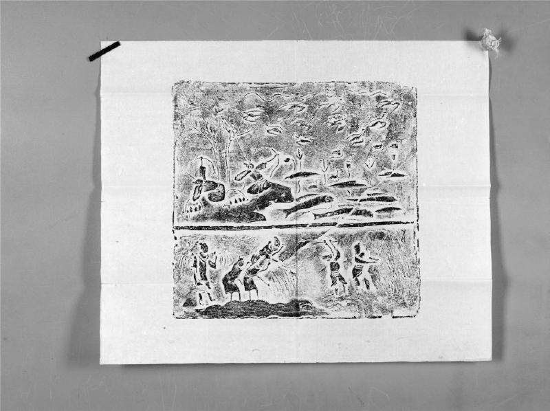 这块东汉画像砖由弋射、收获两幅图组成。上图“弋射”约占砖面的三分之二,右边是一莲池,莲花垂露,莲叶浮于水面。水下有大鱼数尾,水面野鸭数只。莲池上空,一群鸟往东西两边疾飞。左边树荫下隐蔽着二弋人正张弓欲射。射者身旁各置一架,架内有四“磻”。古代称这种射法为“缴射”和“弋射”。下图“收获”刻画了在一稻田里,右端二人镰刀割禾,其左三人俯身张臂,收割谷穗。最左一人好像送完了饭,手提食具正欲离去。