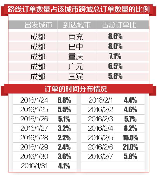 通过滴滴后台的数据,记者发现不少现在居住在成都的人们已经开始发出春运顺风车订单了。其中,在1月11日至1月18日24点期间预约的、出行时间为1月24日至2月7日期间的跨城顺风车最热门的线路分别为:成都到南充、成都到重庆、成都到巴中、成都到广元及成都到宜宾。