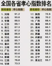 1月29日,一份“中国孝心地图”在网络上迅速走红。该地图不仅显示全国30多省区市的孝心指数,更有各省孝心详细排名。其中,河南、山东、安徽位列孝心省份前三名,北上津等经济发达城市排名意外靠后,东北三省则排名垫底。
