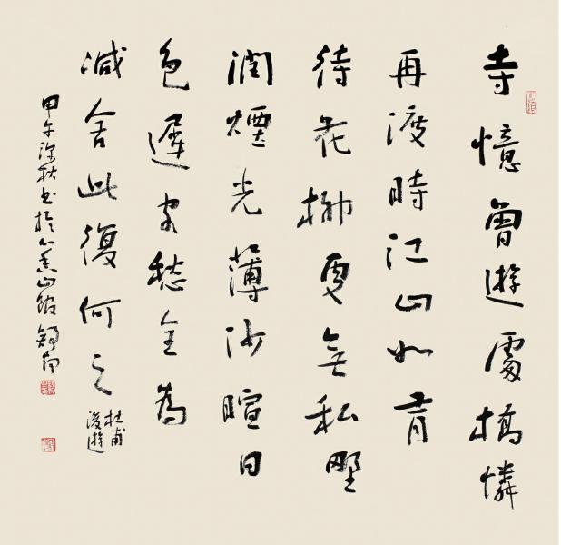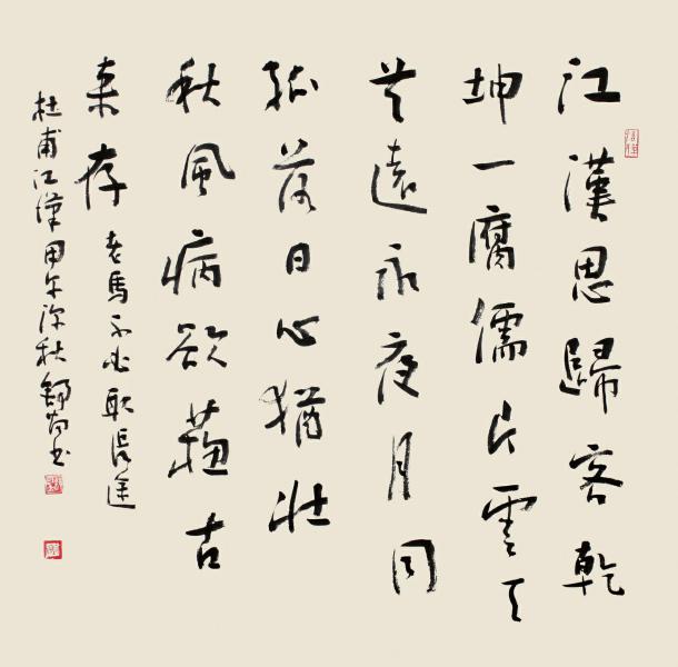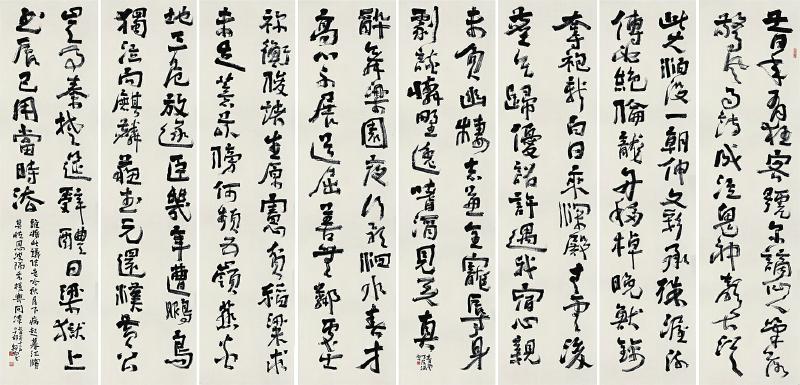 舒炯草堂,坐落在成都浣花溪畔。因杜甫而名扬天下。前后有三年的时光,这里曾是诗人身体与心灵的栖息场所。忧国忧民悲欢离合之泪,抛洒此处,化为二百多首经典名篇。成都遂成为诗人的第二故乡。得江山之助,造就“诗中圣哲,笔底波澜”。这波澜却荡漾起我心中的涟漪,艺术生活的缘起。儿时的我,在长辈的带领下,迈入草堂花径,走进秋风茅屋,寻觅着先贤的足迹。伴随着年龄的长大,诗人那悲凉慷慨、沉郁顿挫的诗歌,愈来愈撩拨着我的心弦。似有一种东西欲喷薄而出。“致君尧舜上,再使风俗淳”。这是杜公的中国梦,我则用书法演绎我的中国梦。我的思绪沿着历史长河,溯流而上,跨越时空与诗圣相逢。我捉管在手,笔下点画跳跃,线条飞舞,或轻或重,或急或缓;秀蕴刚兮武涵文,屈伸吐纳如太极。行气如九曲珠,运劲如百炼钢。酒酣耳热行草出,块垒欲浇呈碑笔。大屏风、小屏风,中堂单条铺满地。情已抒,气白畅,手卷、横推、差可拟。草堂花开花落,香气弥漫天地,伴随我心,奔向远方……。