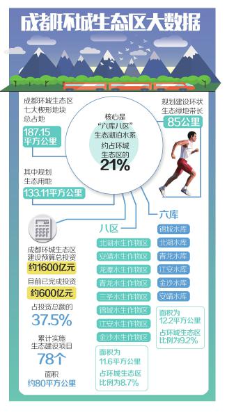 记者了解到,成都环城生态区是中心城区范围绕城高速公路两侧各500米及周边七大楔形地块的187.15平方公里区域,其中规划生态用地133.11平方公里,规划建设环状生态绿地带长85公里,核心是“六库八区”生态湖泊水系,约占环城生态区的21%。