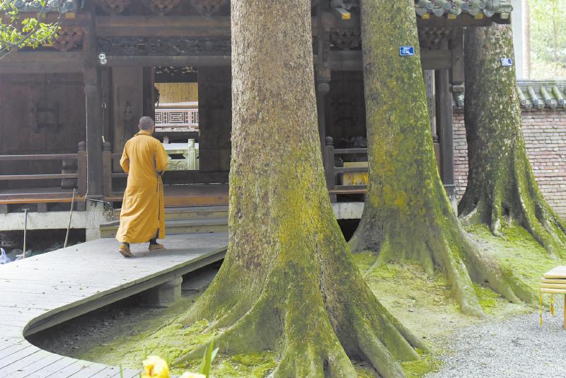 20年来,胡孝云每天都要来看护这些树。又是一天清晨,他来到林中,与寺庙中的居士打个招呼,拿着锄头开始在林中翻土。古刹钟声又起,一双双白鹭从楠木葱茏的枝叶间腾飞,树叶随着春风沙沙作响,仿佛在吟唱着千百年来的人世兴衰。