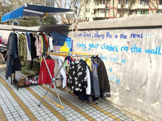 志愿者小周和她的同学们是这面墙的最初发起者之一。小周刚大学毕业,从一个微信公众号上看到了关于伊朗“友善之墙”的介绍,“当地人自发地把衣物挂在墙上,供流浪人群自行取用。恰好我自己也有很多闲置的衣服,就想到我们能不能也在成都弄一面友善之墙,将自己多余的衣服捐赠出去,让有需要的人取用。”小周告诉记者,他将自己的想法告诉几个朋友后,大家一拍即合。几个年轻人说干就干,2月1日凌晨,大家打着手电筒用蓝色涂料在墙壁上涂上房子的形状,并在上面钉上挂钩,还在旁边摆放了一个鞋架,成都的首面“友善之墙”就此诞生。
